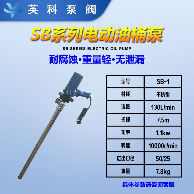 品牌:英科 型号:SB-1 压力:0.1 Mpa 材质:不锈钢 泵轴位置:边立式 叶轮吸入方式:单吸式 驱动方式:电动 性能:不阻塞 流量:9 m3/h 叶轮数目:单级 适用范围:油品 扬程:10 m 叶轮结构:半开始叶轮 工作压力:0.1 电动抽油泵