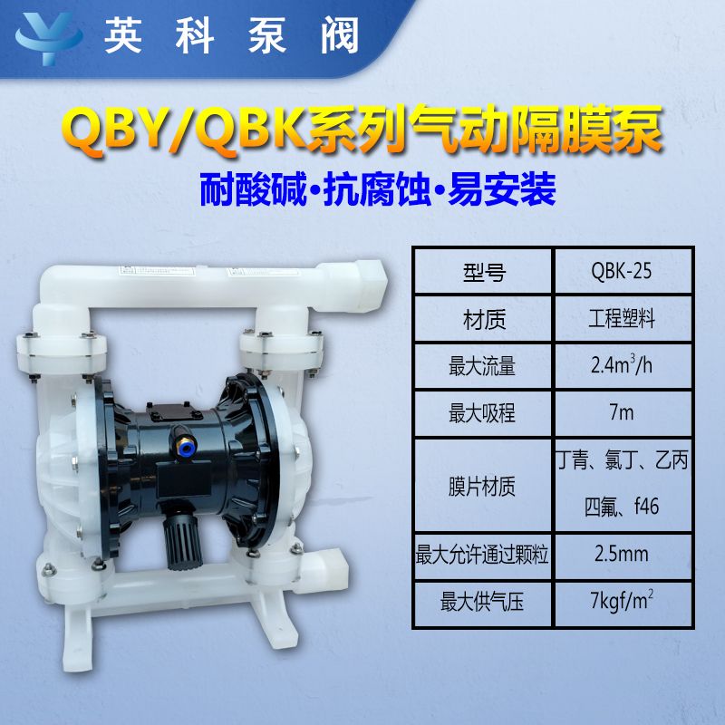 品牌:Y 材质:工程塑料 性能:耐腐蚀 驱动方式:气动 空气消耗量:0.3-1.5 最大供气压力:0.7 允许颗粒值:10 mm 吸程:5 m 出口压力:0.7 Mpa 扬程:50 m 流量:0-30 m3/h 工作压力:2-7 型号:QBY-25 气动隔膜泵 耐酸碱 工程塑料气动隔膜泵膜片材质