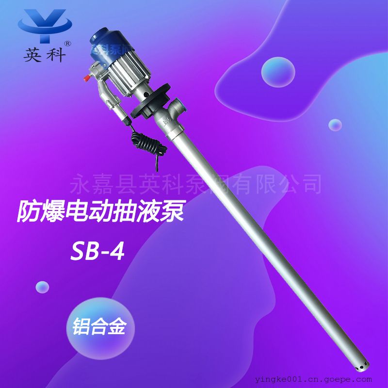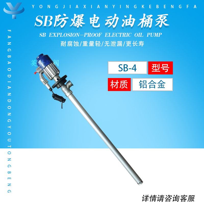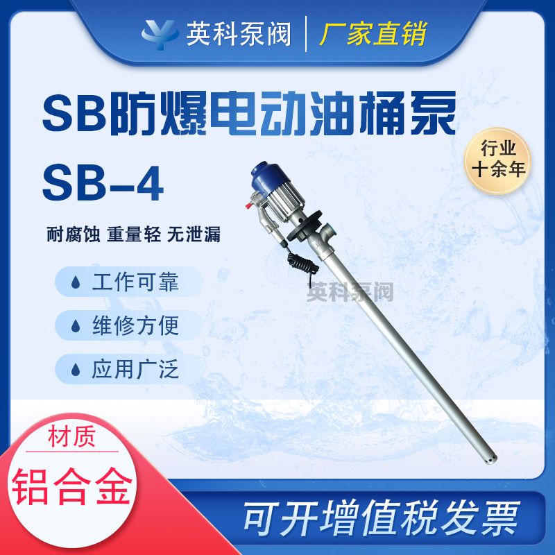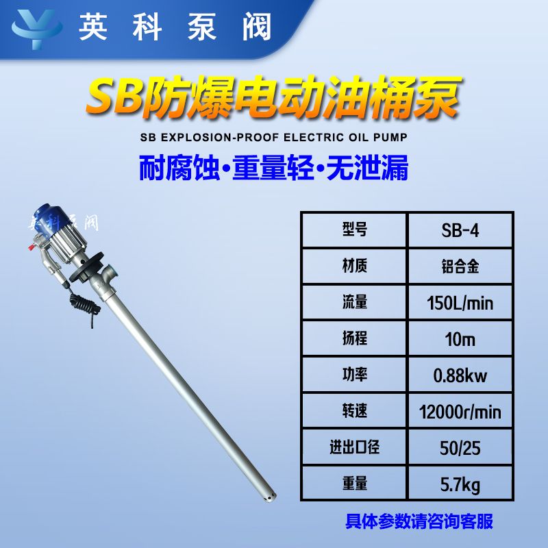 品牌:英科牌 材质:铝合金 驱动方式:电动 流量:9 m3/h 性能:防爆 扬程:10 m 汽蚀余量:2.2 m 吸入口径:50 mm 排出口径:25 mm 型号:SB-4 英科牌手提式防爆电动抽液泵SB-4 电动油桶泵参数